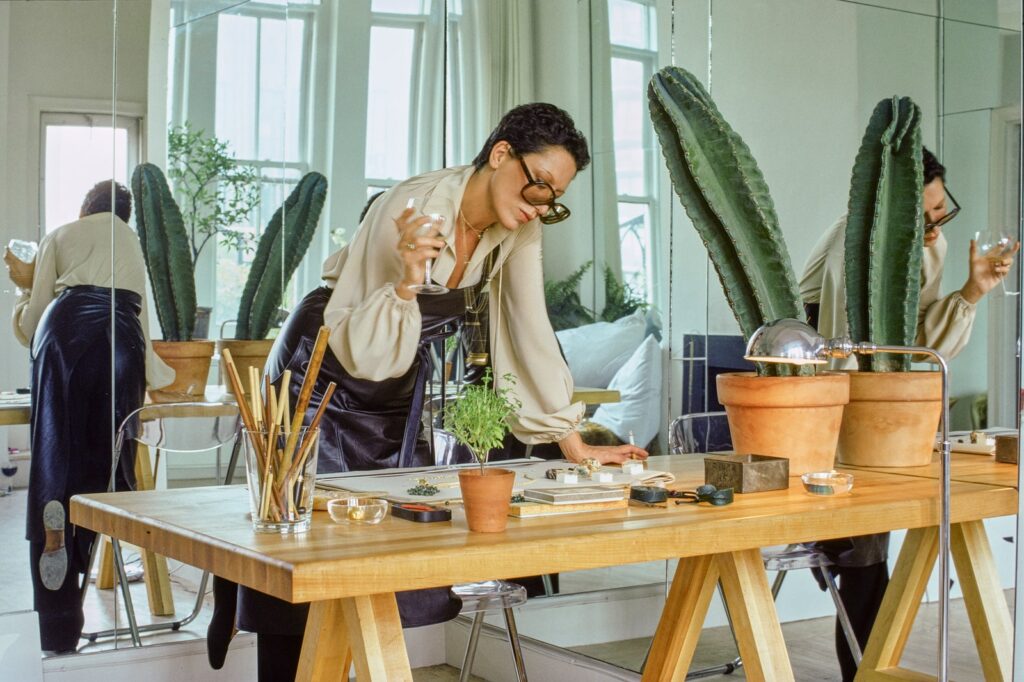 [Elsa Peretti en su estudio. Diciembre de 1974. Fotografía de Duane Michals para Vogue.]